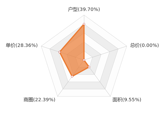 针对楼盘的属性,中山用户主要关注的是楼盘的户型、楼盘的单价和楼盘所在的区县商圈,关注度占比分别为39.70%、28.36%和22.39%。
