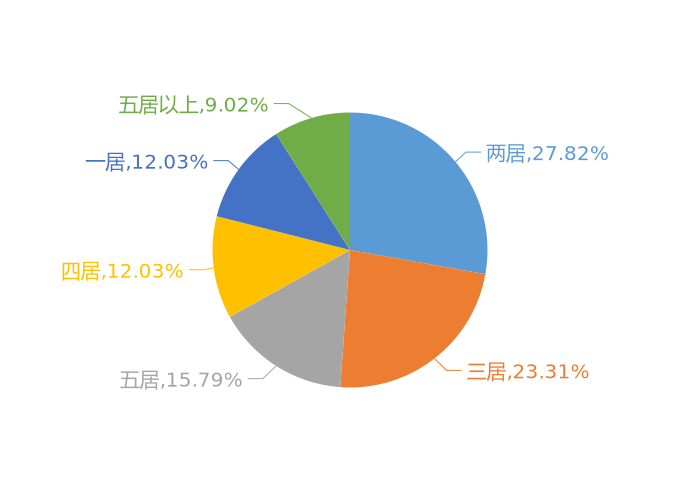 3月份中山针对新房,用户最关注的居室为两居,关注度占比为27.82%,其次为三居,关注度占比为23.31%,五居用户关注度排名第三,关注度占比为15.79%。