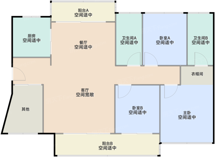 各个空间户型方正,方便室内家具布置;全明通透户型,居住舒适度较高,整个空间采...