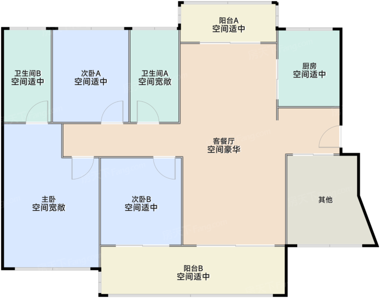 各个空间户型方正,方便室内家具布置;整个空间全明通透,采光良好,同时利于居住...