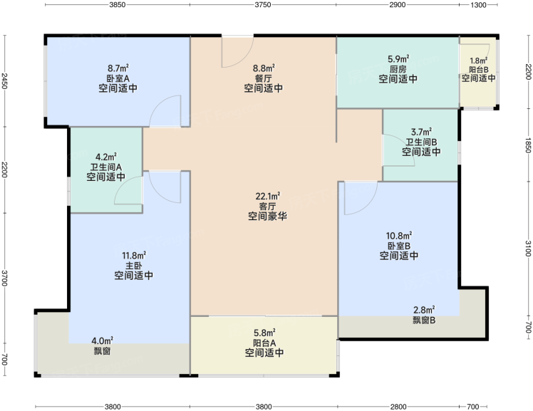 整体户型方正,活动区域开阔,居住舒适度高;全明户型,各部分空间均有窗,可保证...