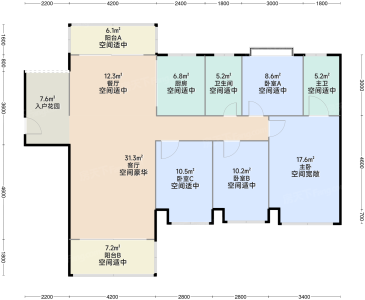 各个空间户型方正,后期空间利用率高;全明通透户型,居住舒适度较高,整个空间采...