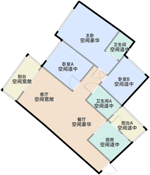 各个空间户型方正,后期空间利用率高;全明户型,各部分空间均有窗,可保证整体空...