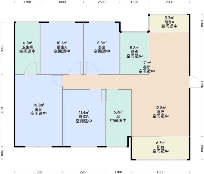 各个空间户型方正,后期空间利用率高;整个空间全明通透,采光良好,同时利于居住...